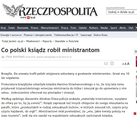 Ks. Marcin Strachanowski, polski ksiądz pracujący w Rio de Janeiro, został trzy lata temu uwolniony przez sąd od zarzutów molestowania seksualnego nieletnich. 8 listopada 2010 r. został zwolniony z brazylijskiego aresztu, w którym spędził 114 dni.
