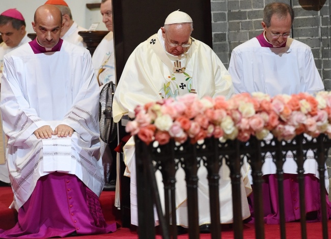 Zanim opuszczę Koreę, pragnę podziękować Pani Prezydent Republiki, Park Geun-hye, władzom cywilnym i kościelnym oraz wszystkim, którzy w jakikolwiek sposób przyczynili do umożliwienia tej wizyty. Pragnę szczególnie skierować słowa osobistego uznania do koreańskich księży, którzy na co dzień pracują w służbie Ewangelii i budowania Ludu Bożego w wierze, nadziei i miłości. Proszę was, jako posłanników Chrystusa i sługi Jego jednającej miłości (por 2 Kor 5, 18-20), byście nadal budowali pomosty szacunku, zaufania i zgodnej współpracy w waszych parafiach, między sobą i ze swoimi biskupami. Wasz przykład bezwarunkowej miłości do Pana, wierności i poświęcenia dla waszej posługi oraz troski charytatywnej o potrzebujących w znacznym stopniu przyczyniają się do dzieła pojednania i pokoju w tym kraju.