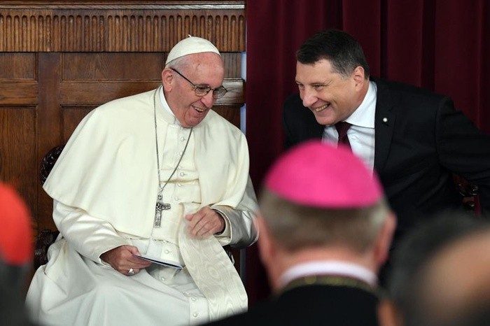 Dziękuję Panu, Panie Prezydencie za uprzejme słowa powitania, a także za zaproszenie skierowane do mnie podczas spotkania w Watykanie. Cieszę się, że po raz pierwszy udało mi się przybyć na Łotwę i do tego miasta, które podobnie, jak cała wasza ojczyzna zostało naznaczone trudnymi doświadczeniami społecznymi, politycznymi, gospodarczymi, a nawet duchowymi - z powodu podziałów i konfliktów z przeszłości - ale które dziś stało się jednym z głównych ośrodków kulturalnych, politycznych i portowych regionu. Wasi przedstawiciele w dziedzinie kultury i sztuki, a zwłaszcza świata muzycznego, są dobrze znani za granicą. Dziś również ja mogłem doświadczyć tego na lotnisku. Dlatego sądzę, że można do was słusznie zastosować słowa Psalmisty: „Zmieniłeś skargę moją w taniec” (Ps 30, 12). Łotwa, ziemia „dainy” [forma pieśni], potrafiła zmienić swoją skargę i cierpienie w śpiew i taniec, i dążyła do przekształcenia się w miejsce dialogu i spotkania, pokojowego współistnienia, które stara się patrzeć w przyszłość.