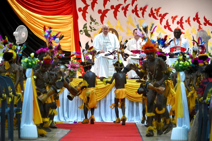 Franciszek do dzieci ulicy oraz dzieci i młodzieży niepełnosprawnej, spotykając się naz nimi terenie technikum prowadzonego przez Caritas w Port Moresby(Papua Nowa Gwinea).