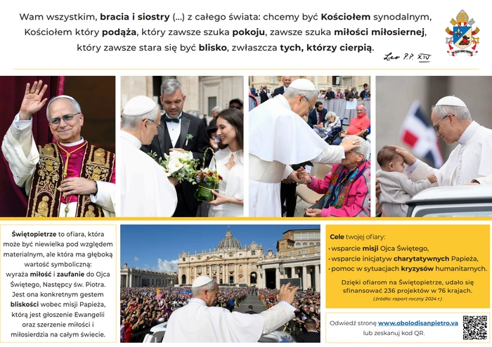Pomagać Papieżowi, czynić dobro. Towarzyszyć mu w głoszeniu chrześcijańskiego przesłania, wspierać jego działalność charytatywną wobec tych, którzy żyją w warunkach niegodnych, pomagać mu promować pokój. W tym właśnie tkwi sens świętopietrza – wielowiekowej praktyki solidarności na rzecz papieży, która ma swoje korzenie w Ewangelii. Tradycyjny dzień zbiórki przypada 29 czerwca, w dniu, kiedy Kościół wspomina w liturgii świętych Piotra i Pawła. Zbiórka ta jest konkretnym sposobem wsparcia Papieża Leona XIV w jego misji służby Kościołowi powszechnemu.